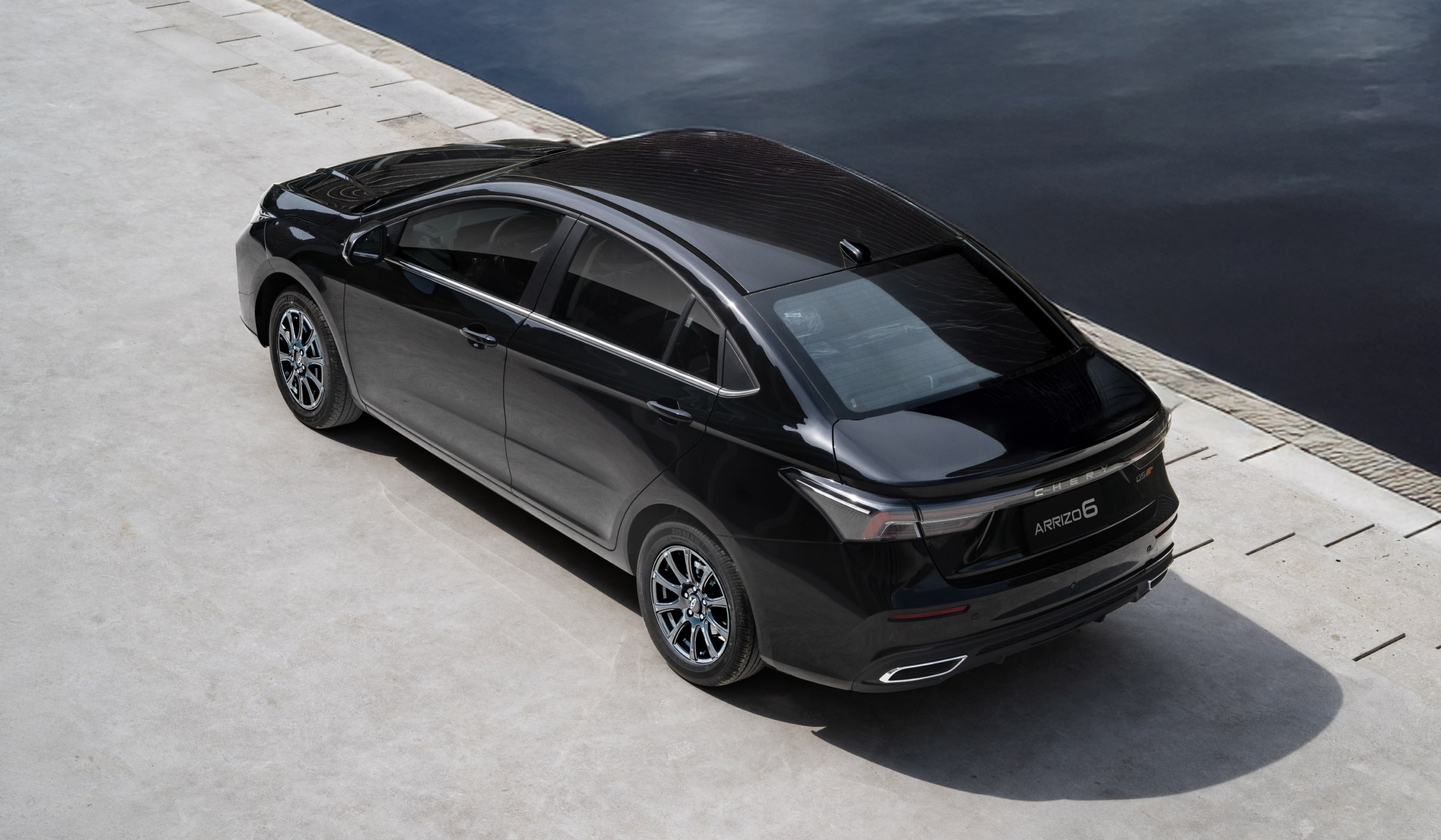 Задняя часть Arrizo 6 выглядит современно и гармонично: узкие светодиодные фары подчёркивают ширину кузова, а аккуратный бампер с хромированными акцентами завершает образ динамичного седана.